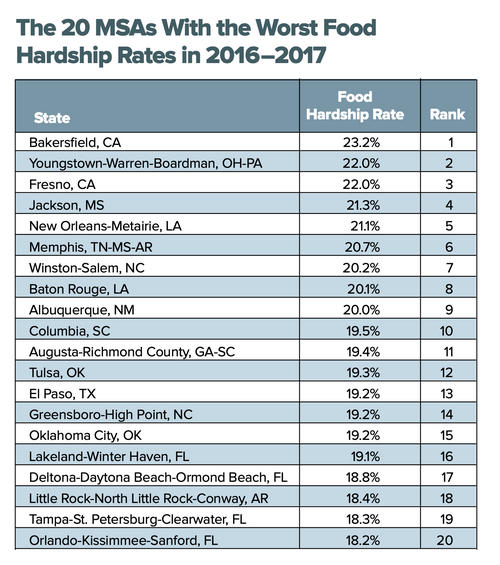 In 2016 and 2017, The Food Research Action Center (FRAC) ranked Bakersfield,