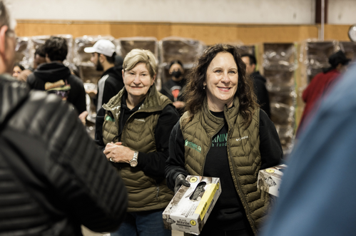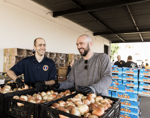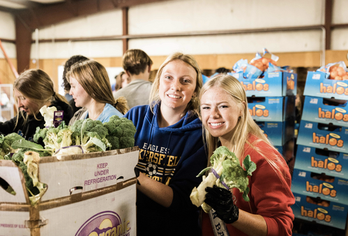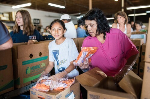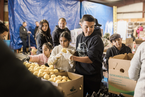 Teams of people work together to fill over 500 boxes with fresh fruits and vegetables,